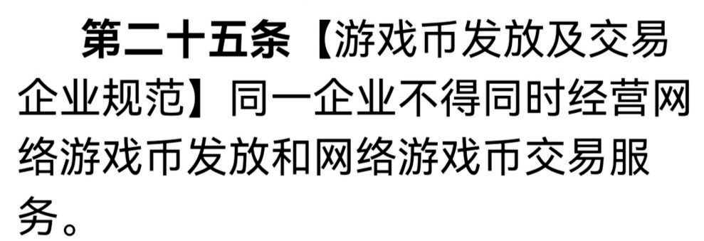 2023年12月22日,国家新闻出版署发布《网络游戏管理办法(草案征求意见稿)》,向社会公开征求意见。其中第二十五条提出,同一企业不得同时经营网络游戏币发放和网络游戏币交易服务。
