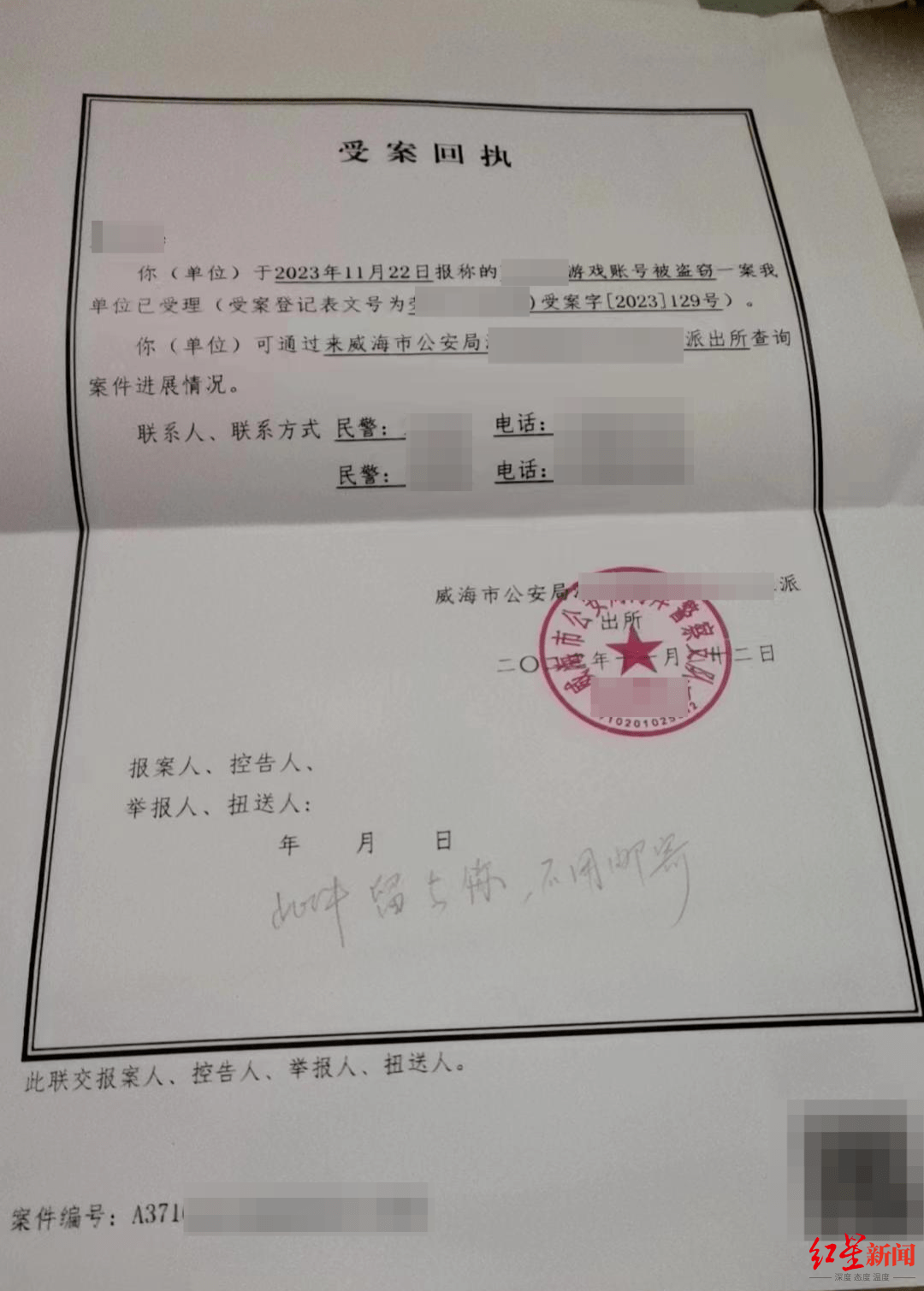 ▲王同学“恶意找回”账号一事此前的相关受案回执。受访者供图