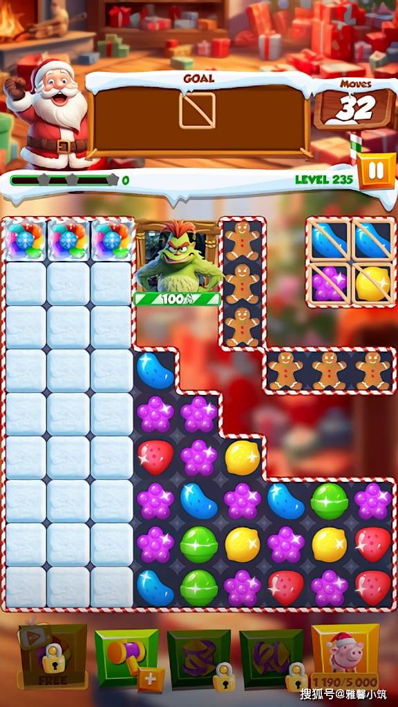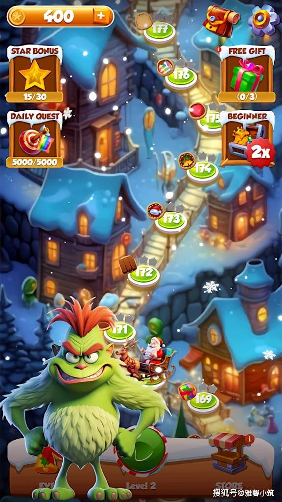 《Christmas Magic: Match 3 Game》的美术采用了经典的欧美卡通化风,经典的圣诞老人仿佛是从动画片里走出来的一般逼真可爱,恐怖的绿色怪兽则让人联想起了《怪兽电力公司》里经典角色。在圣诞氛围的衬托下,雪花成为了游戏中的标配,不论是被冰雪覆盖的场景,还是关卡中作为消除道具的雪球,随处可见的白色几乎成为了游戏的主要色调。