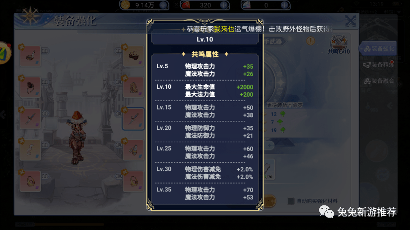 然后装备强化的时候,建议平均升级,因为强化有一个共鸣,是按你最低的装备等级算的,到达一定的等级就会产生共鸣,对于人物提升还是挺多的,但是金币消耗也会越来越多。