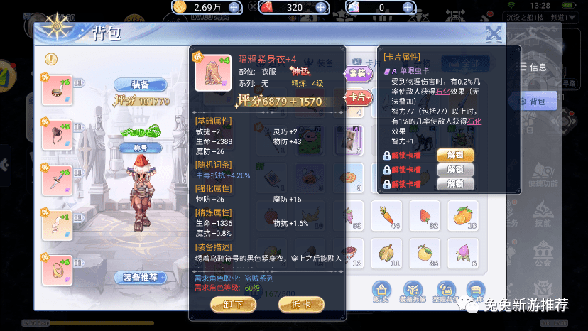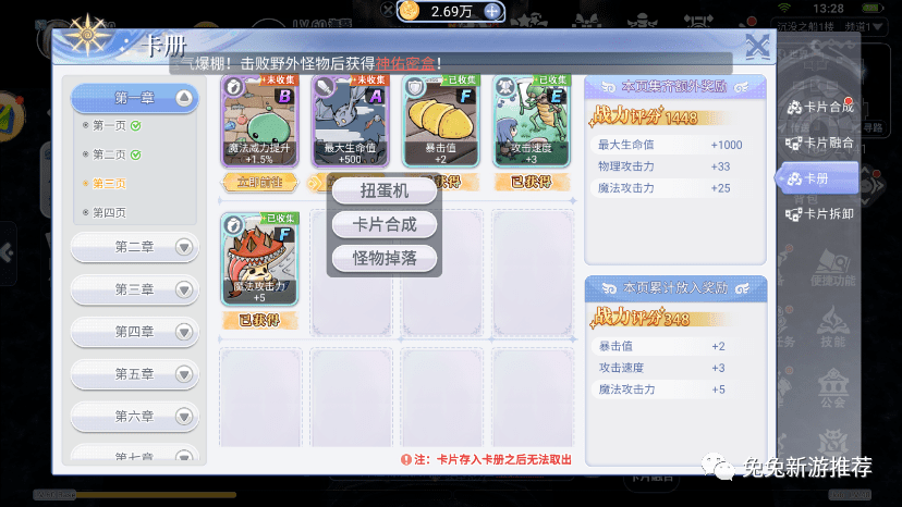 除了装备提升外,还可以通过插卡,收集卡片来提升战力,点击前往可以知道获取卡片获取方法,通过卡片融合可以获得一张新的卡片,但是比较看运气,运气好可以获得一张卡册没有的卡片或更高级的卡片。