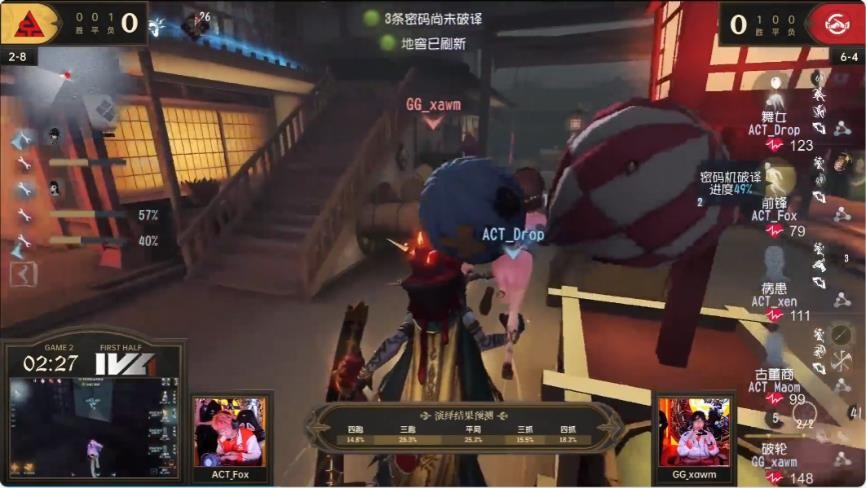 第一局比赛战队和战队以4:4的成绩战平,第二局比赛地图为永眠镇,这张地图是求生者偏优势图。