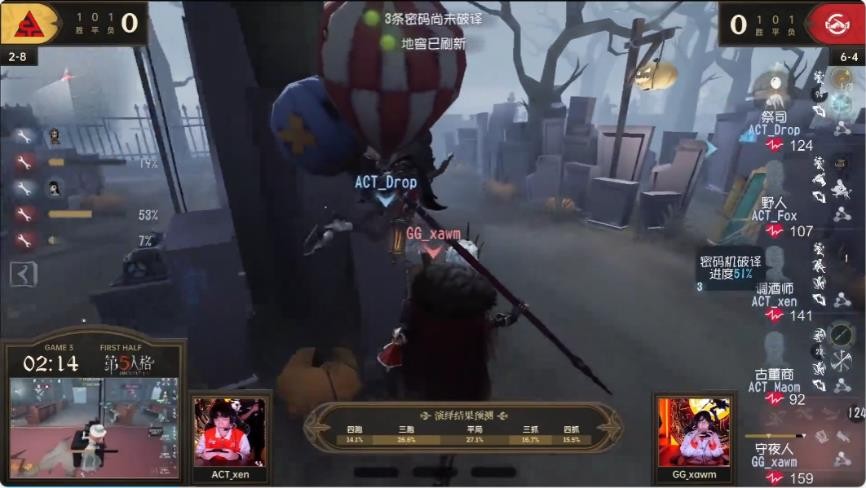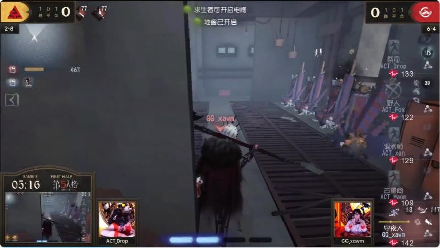 第二局比赛ACT战队以5:3的成绩领先,第三局比赛地图为红教堂,这张地图是求生者偏优势图。