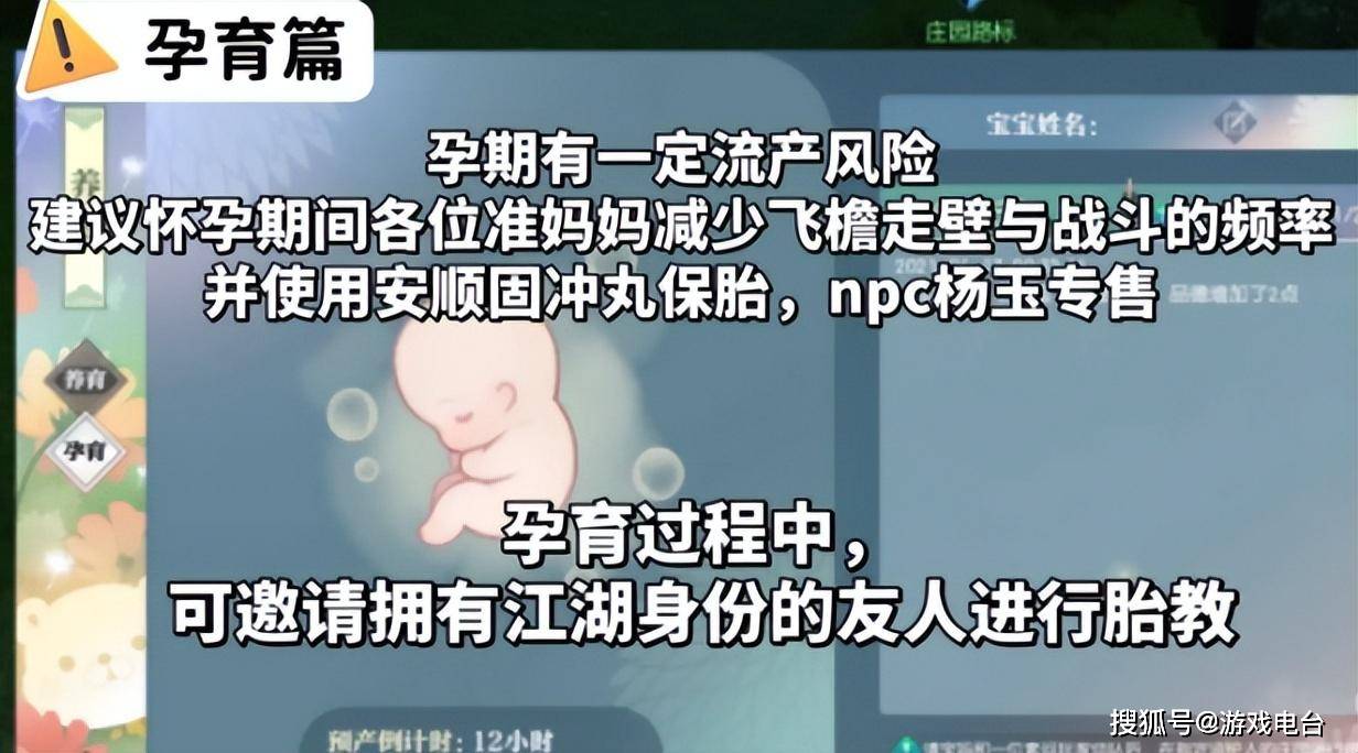 和现实中一样,想要生孩子可没那么轻松。怀孕的女玩家要减少飞檐走壁和战斗的时间,否则有可能会流产。最好在NPC处购买“安胎丸”用以保胎。在孕育过程中,还可以请各类江湖身份的朋友对孩子进行胎教。