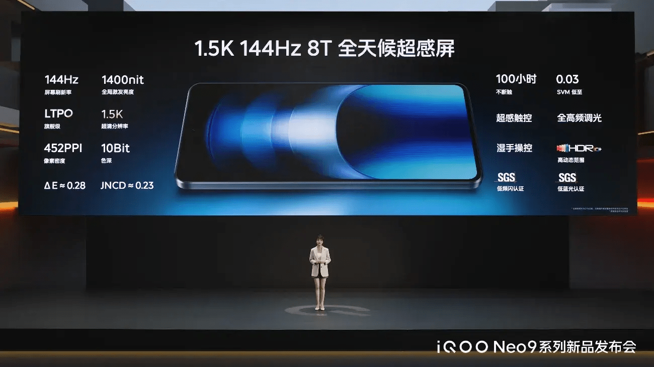 iQOO Neo9系列屏幕也将支持全新调光模式,全系通过SGS低蓝光及低频闪双重认证,让玩家玩得畅快更看得安心。