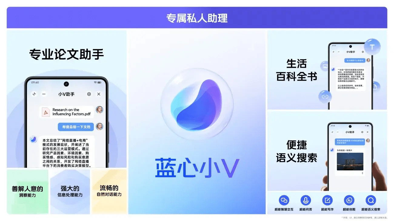 基于OriginOS 4,iQOO Neo9系列首批搭载自研蓝心大模型,用户可以借助新机体验“蓝心小V”提供的诸多智慧体验,让手机将成为口袋中的“超能助理”。