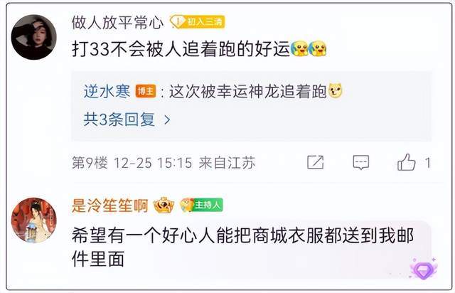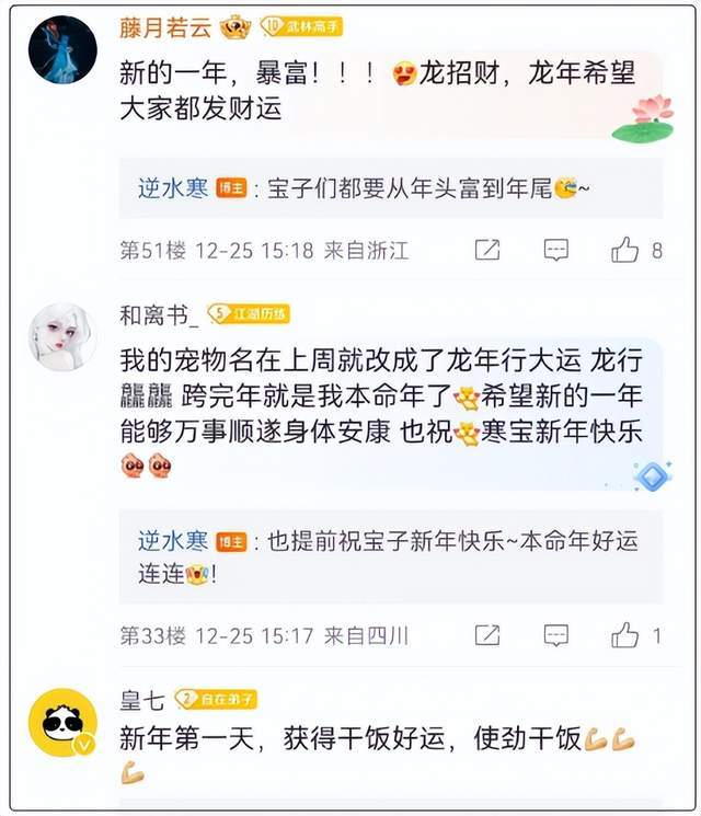 可能是因为《逆水寒》龙年转运活动设计得过于红火,也可能是该游戏玩家数量众多,没想到,当活动公布之后,《逆水寒》官博成了新年许愿池,评论区,玩家都在祝自己好运。
