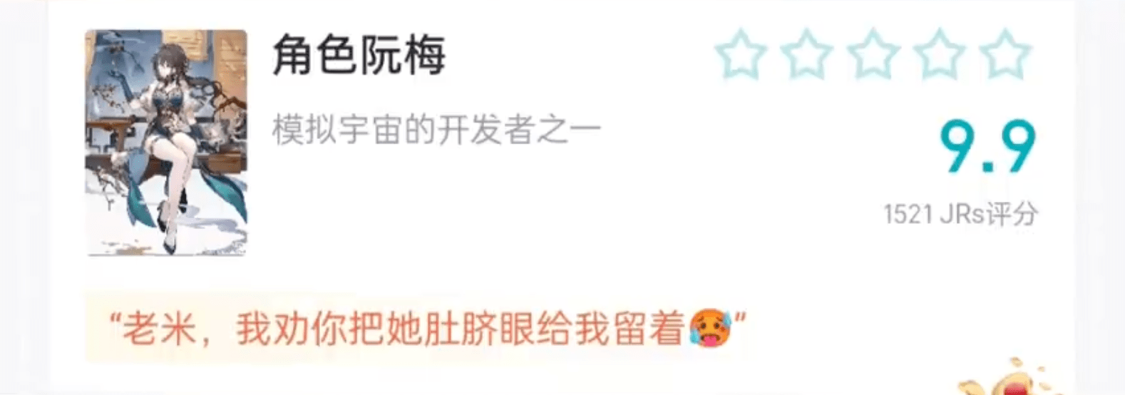 还有在近日更新的1.6版本中上线的新角色阮·梅,这个角色刚曝光就因国风元素获得了很多玩家的喜爱,近期更新的几个角色PV也让玩家认识到她的另一面,人气持续走高。而虎扑评分也是非常真实,阮·梅获得了9.9的最高分,热评也是让人忍不住默默点赞。