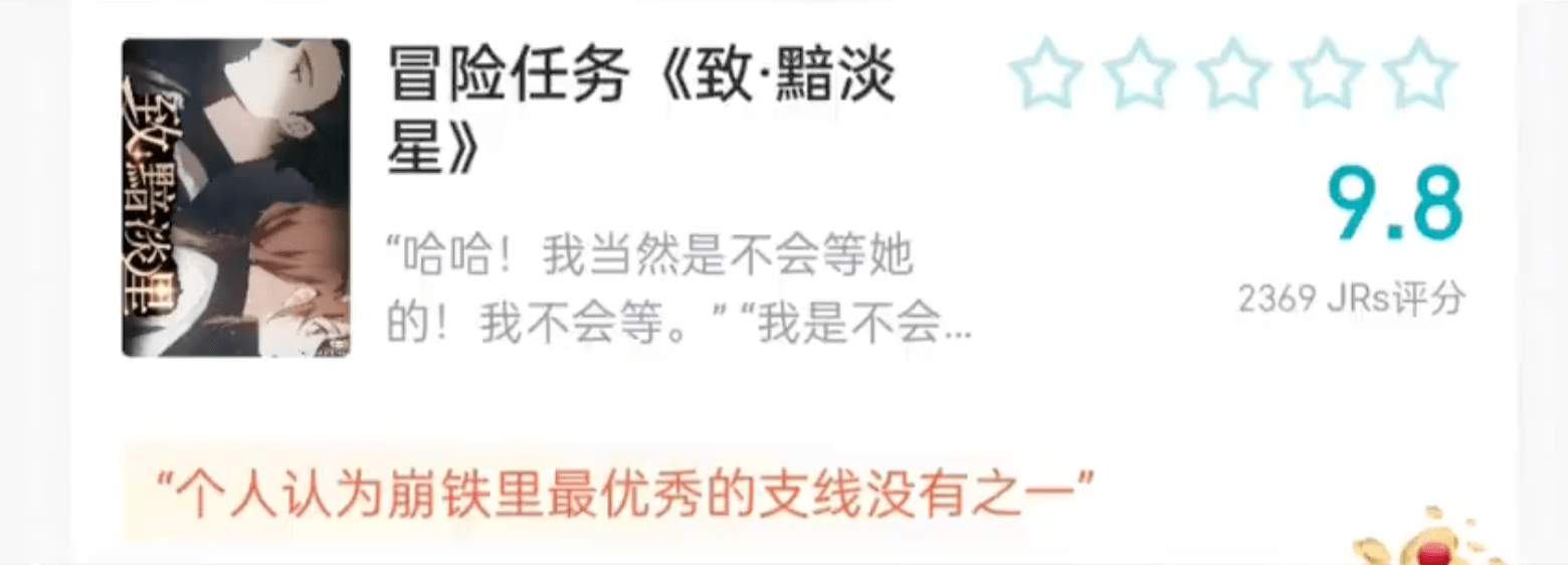 各类任务中,冒险任务《致·黯淡星》的评分最高,有9.8的评分,热评描述是“个人认为崩铁力最优秀的支线没有之一”。这个评论其实有些绝对了,因为其他的任务评分也大多在9.5以上,这点能看出星穹铁道讲故事的能力很强,各类支线任务都能让玩家沉浸其中,去感受故事的魅力和内核,想必这也是任务都能拿到高分的原因。