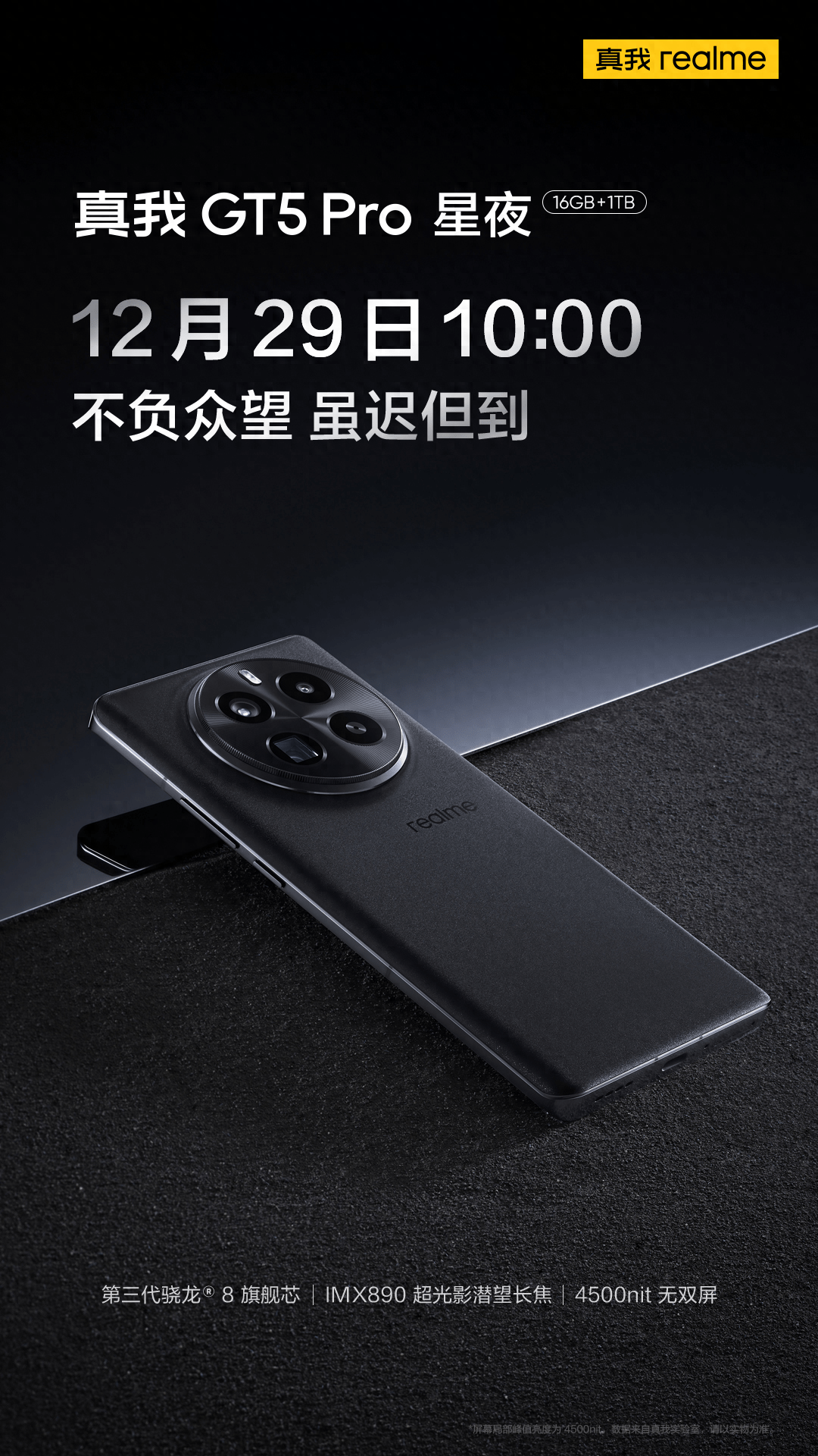 在近期的手机市场中,真我GT5 Pro的热度可以说是相当之高,凭借着过硬的产品力和性价比表现,成为目前手机市场中的真香代表机型,同时也是众多网友换机时的首选新机之一。不过,让大家没有想到的是,就在今天,真我GT5 Pro星夜黑配色推出了16+1TB的超大内存版本,并将于12月29日10:00正式开售,直接成为今日手机圈的热点话题,吸引了大批网友关注和热议。