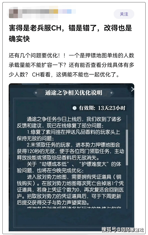 例如赛季服的“天纵时装”,官方说绝版不返场,就是真的不返场,让最初囤天纵的玩家赚翻;另外,新出的内容玩家一骂就滑跪,像押镖被玩家吐槽太难,第二天策划就根据玩家建议做出大量优化。