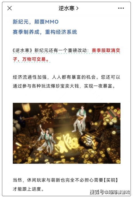 《逆水寒》2.0还有一个最震撼的改革,是经济系统也迎来了大颠覆,官方宣布赛季服将取消运行五年的货币——交子,交子会和铜钱合并,经济流通性加强,人人都有暴富的机会。