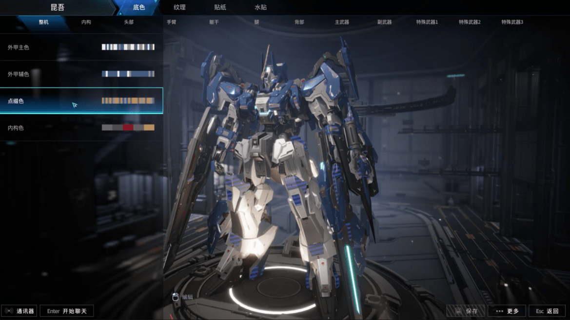 此外,格纳库中也有很多有意思的玩法,比如可以查看武装,了解每台机甲的攻击能力与属性,甚至可以进行训练模式,同时也可以对机甲进行改件和涂装的调整,特别是涂装部分,如果不包含整机的颜色设定,一共有11个部件同时又细分了每个部件下至少有三个或以上的主辅色以及点缀色的调整,每台机甲完成涂装的操作,你甚至可以把它当做一场电子玩胶的体验。