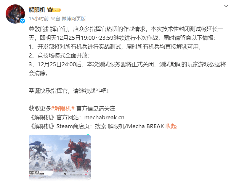 而且,游戏原定4天的测试时间里,许多玩家玩上头之后表示,这点时间根本不够玩,官方更是直接决定在原有测试期的基础上临时再增加一天,官方还非常贴心地在测试的最后一天放开了全部机甲和竞技地图的游玩。