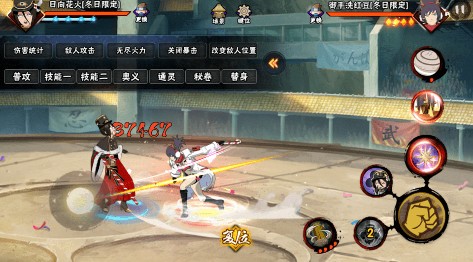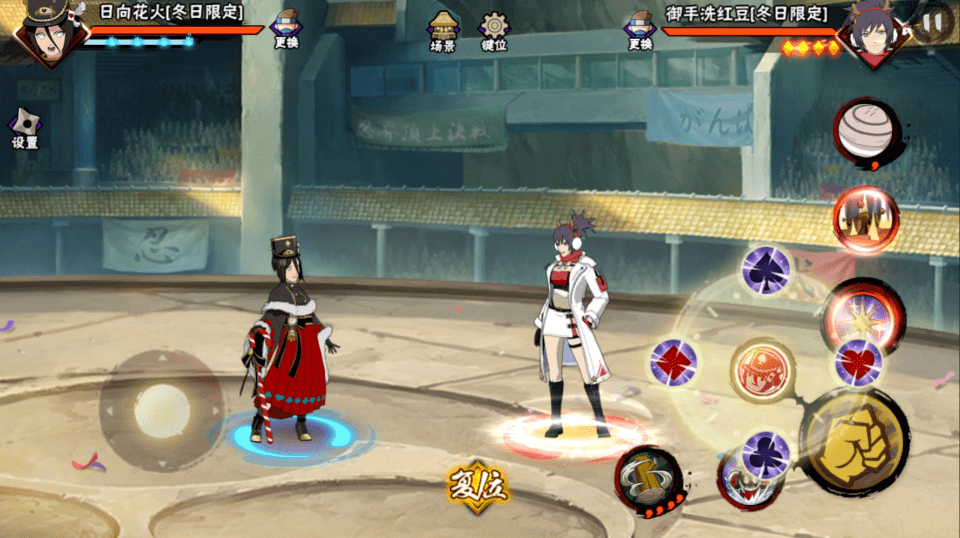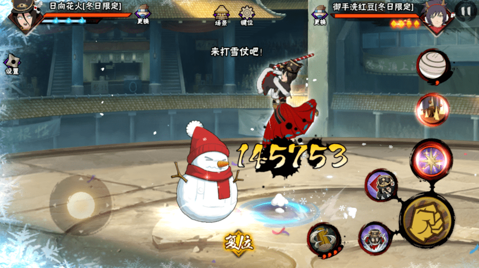 接着再来说一下冬日限定花火的上手体验和实战效果,因为这个忍者的机制变动,导致她在体验上也会有一定的差异。奥义点替换成了能量条,每次奥义键滑动到普攻是释放一次二技能对应的效果,同时消耗一格能量条。默认登场是黑桃,释放出去的空掌附带一些寒霜效果,这个技能也算是冬日限定花火比较主要的起手技能。右侧的红桃是回天,左侧的方块是突进抓取把对方变成小雪人,下滑的梅花是防反技能,无法主动释放后续的攻击,只能在防反成功后才会有雪橇车落下来的效果。