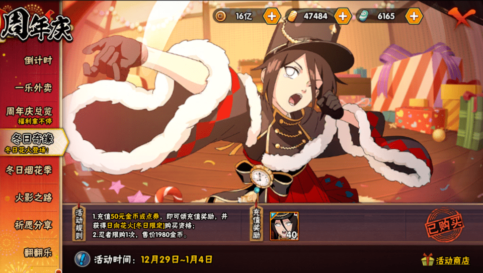 在经历了几次的时间变动后,冬日限定的花火终于是上线了,这个忍者的招募形式还是充50拿到奖励并且解锁资格,然后再用1980金币购买忍者。另外几个返场的冬日限定忍者和圣诞忍者也都是老价格,680点券一个。如果你是老玩家的话应该还记得,老忍者返场的获取方式修改过。原本是充值50解锁新忍者的购买资格,然后其他忍者也是1980金币一个,只是后来魔方把老忍者从金币改成了点券形式。
