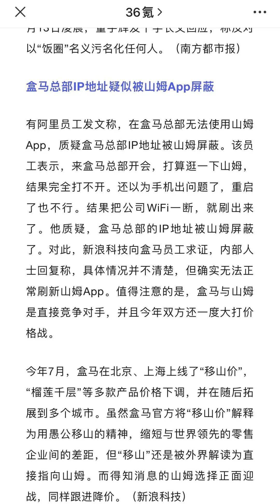 而山姆那边,最近据传盒马总部IP地址疑似被山姆App屏蔽了。