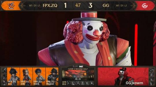 FPX.ZQ的求生者选择了击球手、飞行家、病患、玩具商(BAN蜘蛛、歌剧演员、破轮);成都GG的监管者xawm选择了小丑。(BAN先知、祭司、律师、大副)