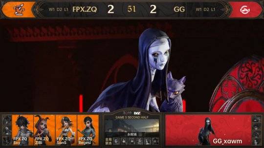 FPX.ZQ的求生者选择了病患、祭司、拉拉队员、古董商(BAN歌剧演员、破轮、邦邦);成都GG的监管者xawm选择了“使徒”。(BAN先知、击球手、飞行家、大副)