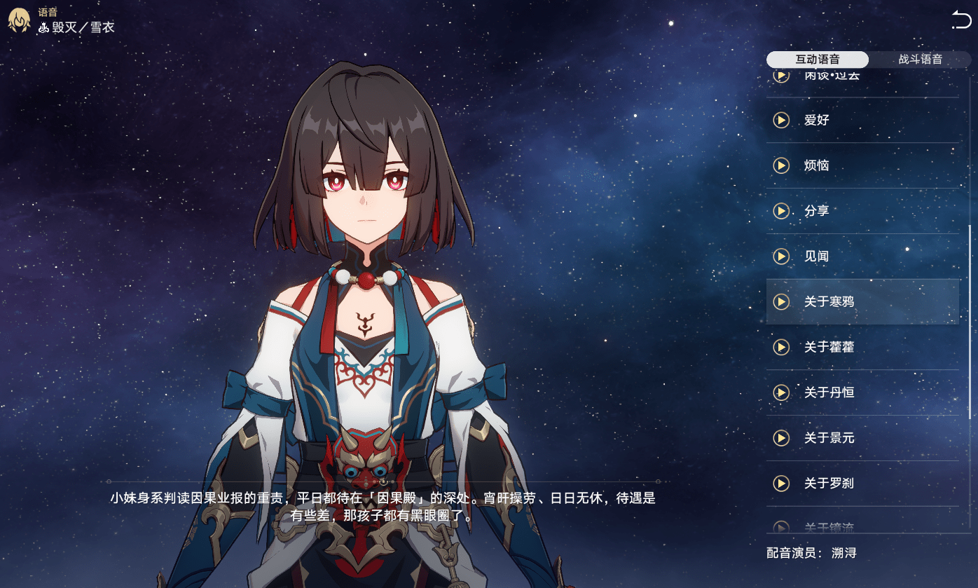 性格方面,雪衣和她的妹妹寒鸦是两个极端,寒鸦外冷内热,雪衣则特别擅长讲冷笑话。别看她在剧情里,面对咱们主角时高冷的不行,可等熟络之后就彻底变了个样。比如在和玩家道别时,会专门用回棺这种词试图逗大家一笑,在战斗中受了轻伤的雪衣会说“伤不到我”,在受到重击的时候,她又会说“伤到又如何”,总之就突出一个“嘴硬”。