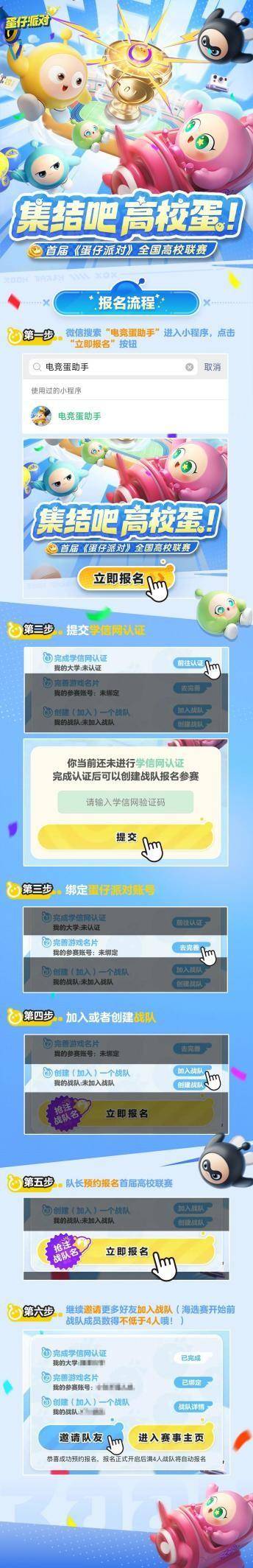 首届《蛋仔派对》全国高校联赛预报名已经正式开启,报名时间将持续至2024年1月14日。想要参与赛事的你,只需微信小程序搜索“电竞蛋助手”,进入小程序后在“高校赛事”专栏点击“立即报名”按钮,完成学信网认证并绑定《蛋仔派对》账号,选择加入或创建战队。