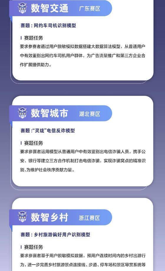 值得一提的是目前三个大赛区的题目已经提前公布,广松赛区的题目方向是“数智交通”,湖北赛区的题目方向是“数智城市”,而浙江赛区的题目方向是“数智乡村”,快来报名吧。