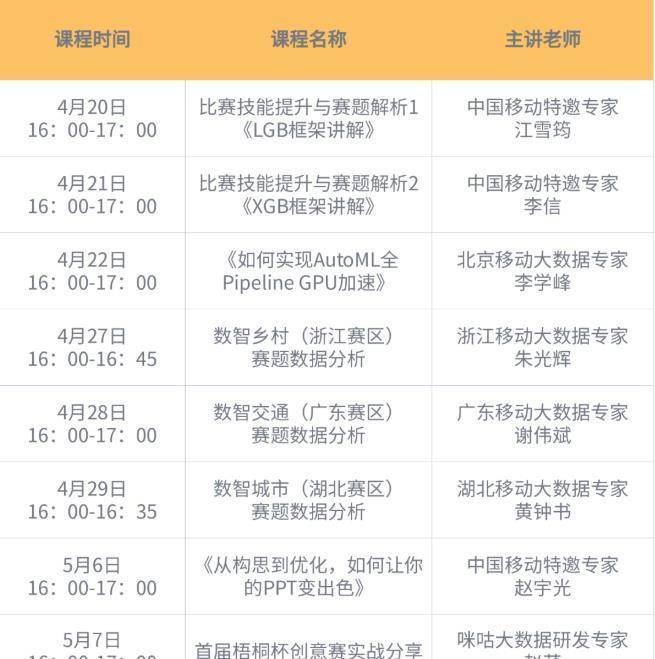 为了能让想报名的学生更快融入竞赛、更好发挥水平,大赛承办方还特意为学生们准备了高能训练营。将会通过直播课的方式进行赛题解析、数据分析等课程,主讲老师均为业内专家。