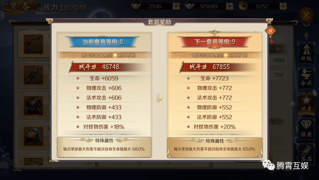3.全身装备部位升星打到3星即可激活升星套装效果,获得额外属性加成,并对于自身星数等级的玩家增加伤害和减免承受伤害。