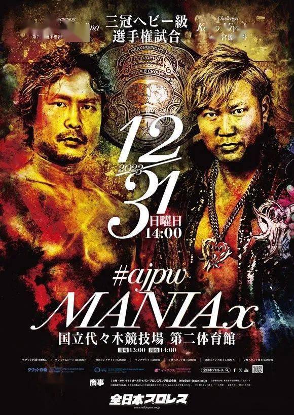 由All Japan Pro Wrestling为您带来的ajpwMANIAx2023大会将于2023年的最后一天12月31日在东京国立代代木竞技场第二体育馆举行!