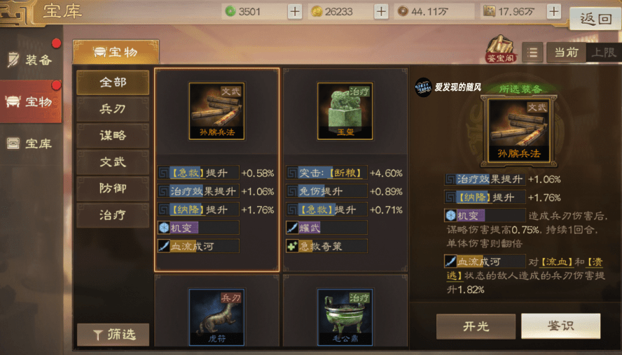 简单地说就是装备栏里面中间那个一直没开启的框框,宝物包含虎符、将印、玉玺、祭鼎、兵法等等,拥有五种定位:兵刃、谋略、文武、防御、治疗,每名武将仅可佩戴一种宝物。