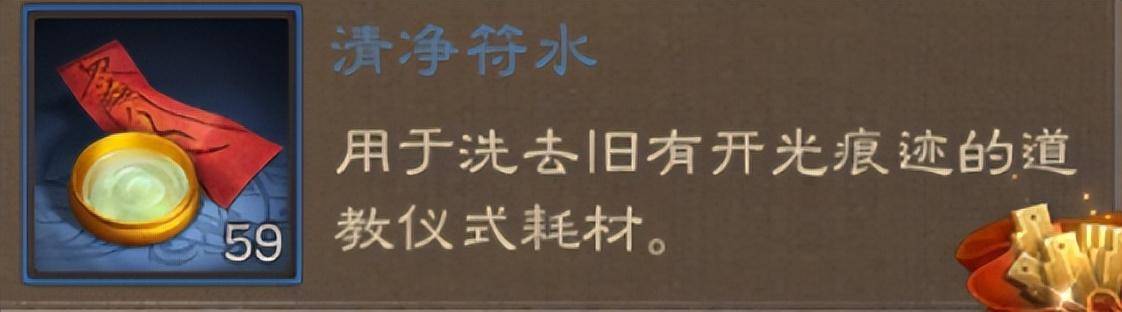【清净符水】还能用于再次开光,可改变当前词条的效果和数值。(相当于超强版五牲脂,直接词条和数值一起随机了)