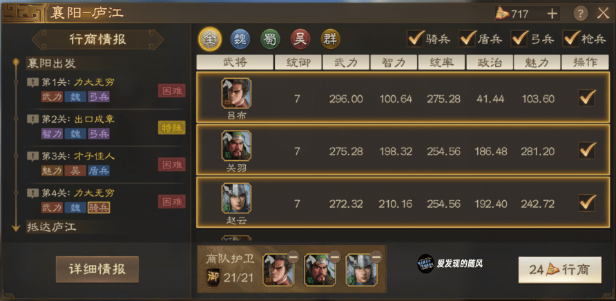 每次行商任务有四关,每关都有固定的属性、阵营、兵种要求,需要在御值限制内派出最符合要求的武将组合,更完美地完成任务。