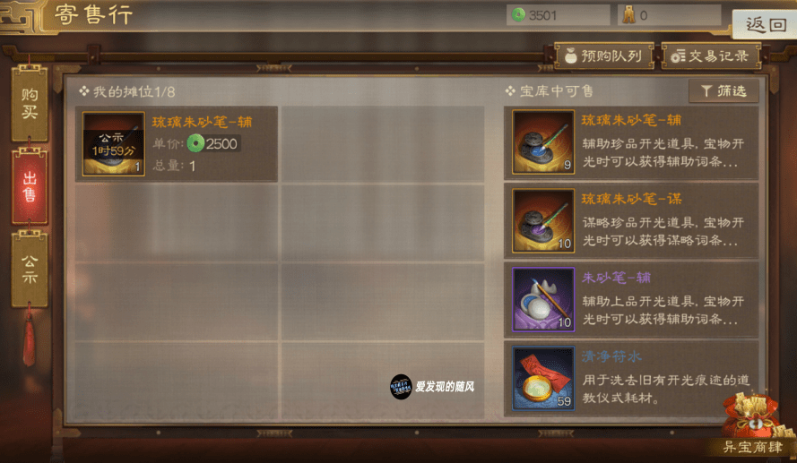 宝物系统最重要的就是每天三次行商任务都要追求更高评价完成,平民建议通过用【清净符水】来开光,前期获得的【朱砂笔】和【琉璃朱砂笔】先售卖换交易币换金铢;中氪建议优先满足起码主力三队的宝物开光之后,有多余的开光道具再售卖,甚至可以适当购买一些开光道具;大佬就不用说了,直接交易行买买买完事了。