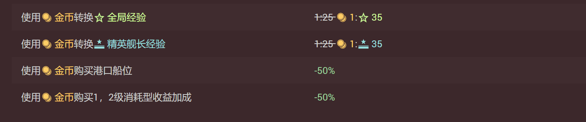 每年的假日季都少不了官方为大家准备的优惠活动,今年也不例外。在新年特别折扣活动中,大家将享受到超值的金币兑换价格,使用金币转换全局经验和指挥官经验时,转换率由原有的1:25提高到现在的1:35。优惠的折扣加上三倍首胜的加持,让你在假日中尽享飞速升级的无限乐趣。