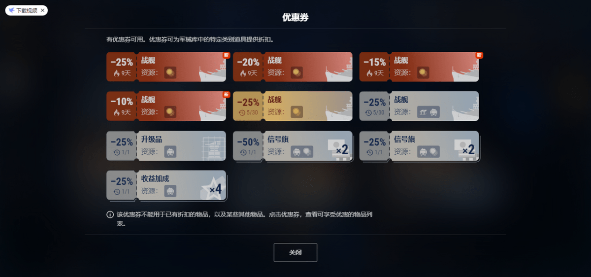 除了上述新年福利,大家在军械库购买战舰、升级品、收益加成、信号旗等资源时,还可使用新年折扣券享受多重折扣福利。玩家使用这些优惠券时最高可享受50%的折扣优惠。
