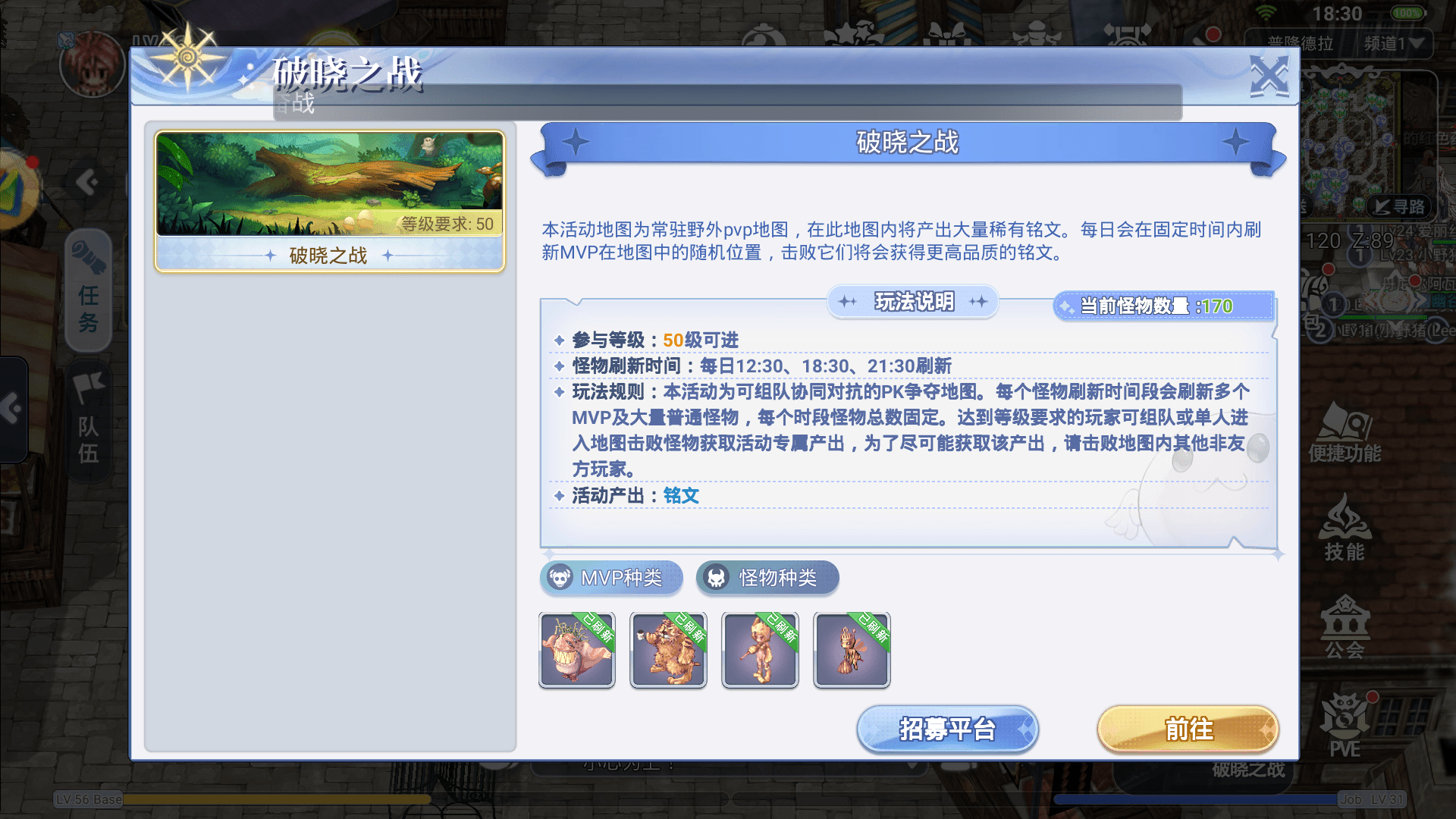 另一种是我们需要去这个PVE里面点开这个破晓之战。破晓之战是角色到达51级开启的。我们进入这个地图里面可以去刷NPC。NPC分为普通,Boss。Boss出金色铭文概率是比较高一点啊。像这个铭文,还有铭文碎片都是可以在这里面打的。