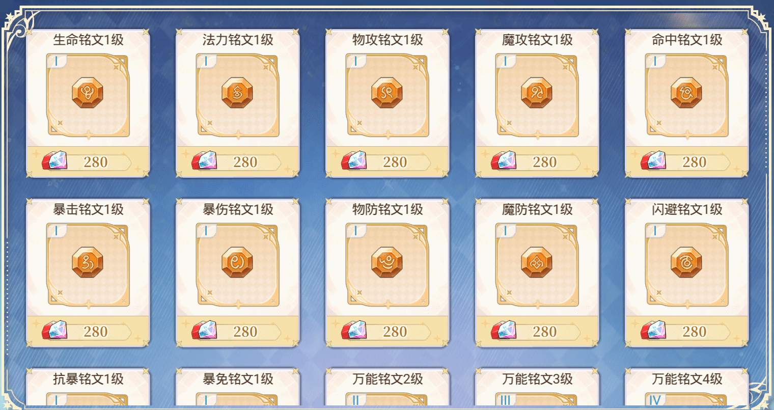 这个铭文的话,分为混合铭文、攻击铭文,防御铭文,万能铭文四种。混合铭文包括生命和法力,攻击铭文包括物攻、魔攻、命中、暴击、暴伤,防御铭文包括物防、魔防、闪避、抗暴、暴免。以上三种类型的铭文,它们提供相应的属性加成。万能铭文包括2到4级,主要来提升其他铭文的等级