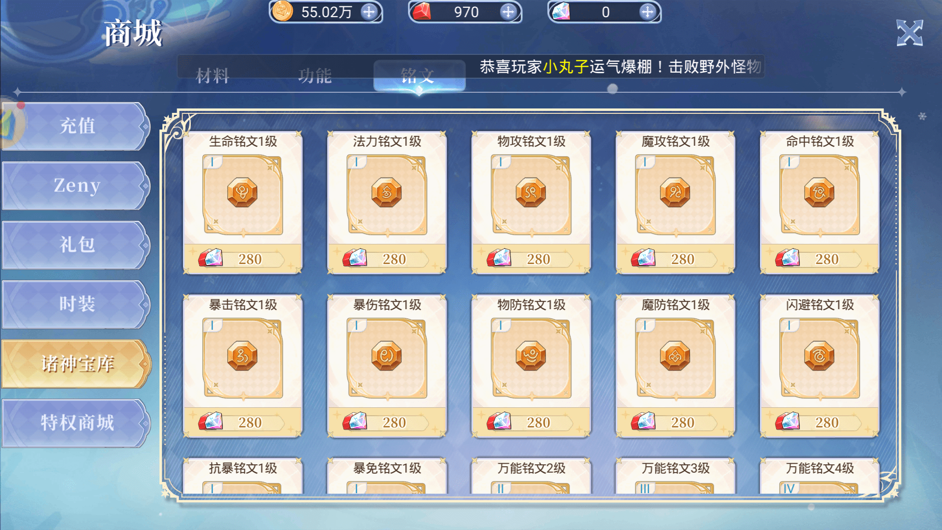 最后一种是我们可以通过红钻或彩砖,在商场中的诸神宝库里来买到各式各样的铭文。