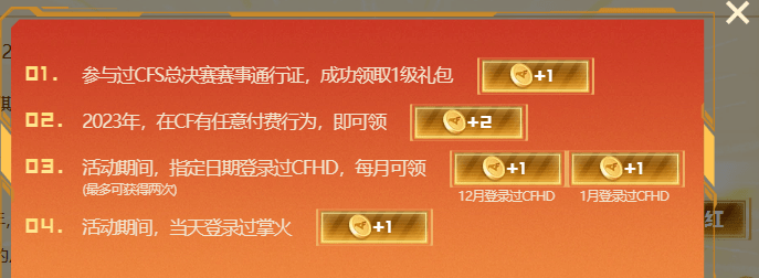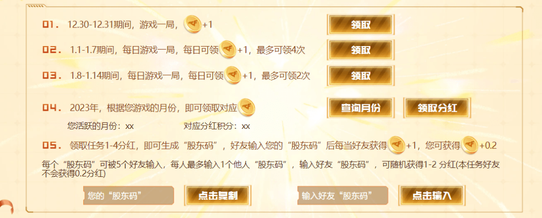 获取“分红”积分的方式有多种,可通过在12.30日-12.31日期间,游戏一局得到1个“分红”积分;在1.1日至7日和1.8日至14日分别可通过每日游戏领取1个“分红”积分,最高可得到6个。活动期间登录过掌火的用户还可额外领取1个“分红”积分哟!