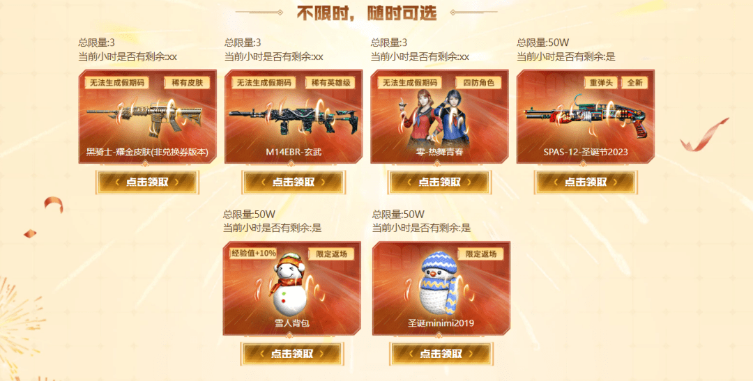 活动期间,当天游戏一局即可获得一次领取机会,该板块的奖池共分为三类,分别为不限时开放、30日当天开放、31日当天开放,在不限时奖励中有黑骑士-耀金皮肤、M14EBR-玄武、零-热舞青春、SPAS-12-圣诞节2023、雪人背包和圣诞面具可供领取。