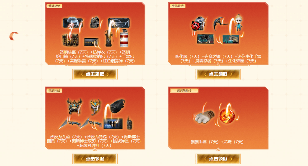 12.30日至1.1日,玩家进入到活动页面可无条件领取爆破、生化、挑战、跳跳乐四种不同的补给套装,每个套装限选一次,模式专属的套装礼包助你畅游各种好玩模式!