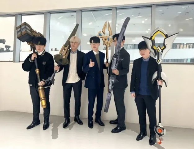 今年T1选手登场的时候,都手握游戏角色武器,Zeus拿着杰斯的锤,Oner拿着芮尔的枪,Faker拿着沙皇的权杖,Gumayusi手握韦鲁斯的弓,Keria是拿着拉克丝的法杖。都是T1在本次世界赛所使用的具有代表性英雄的武器。