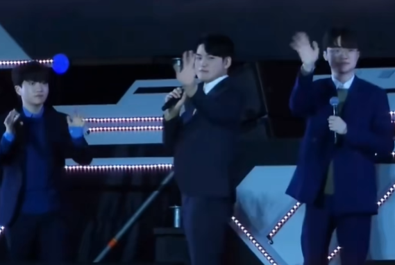 而让线上线下粉丝们没想到的是,T1选手一登场,全体给粉丝们行了跪拜大礼,Faker更是把头埋的极低,被现场的设备挡住,摄像老师在正面都找不到他的身影。