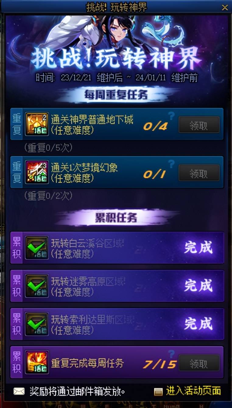 勇士们一上线之后忙于挑战均衡仲裁者和高级地下城,可能会忘记玩转神界这个活动。活动需要大量通关白海区域的普通地下城,分别通关白云溪谷、迷雾高原、索利达里斯三个区域的普通地下城20次还可以获得贴膜装备自选礼盒,笔者建议小伙伴们派自己的小号去刷就可以了。