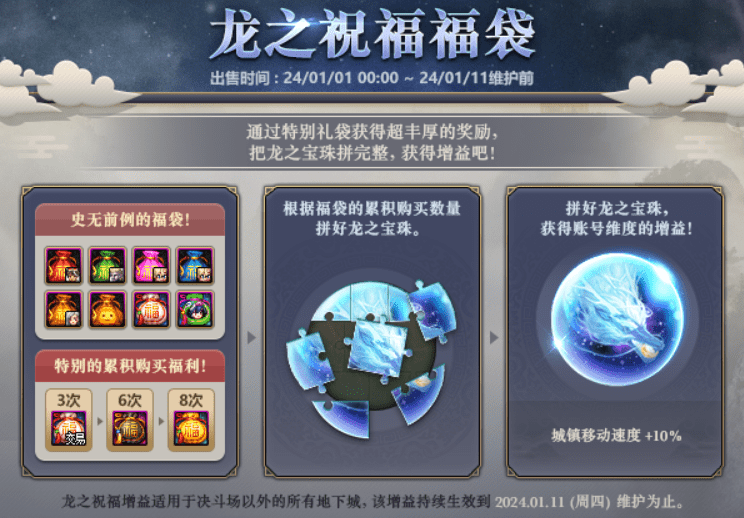 龙之祝福礼袋的上架时间为2024年1月1日,于1月11日下架,累积购买3、6、8款礼袋还可以获得累积购买奖励。礼袋只能使用点券购买,且每款只能购买一次,有需求的小伙伴不要错过。