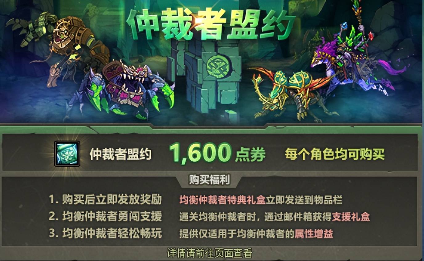 专项服务于均衡仲裁者副本的盟约,售价1600点券,购买之后可以获得大量雾核,且在通关均衡仲裁者之后会赠送雾核礼盒,帮助勇士们节省深渊材料。不过仲裁者盟约是可以使用代币券购买的,这个金币1100万,有需要的小伙伴不要错过。