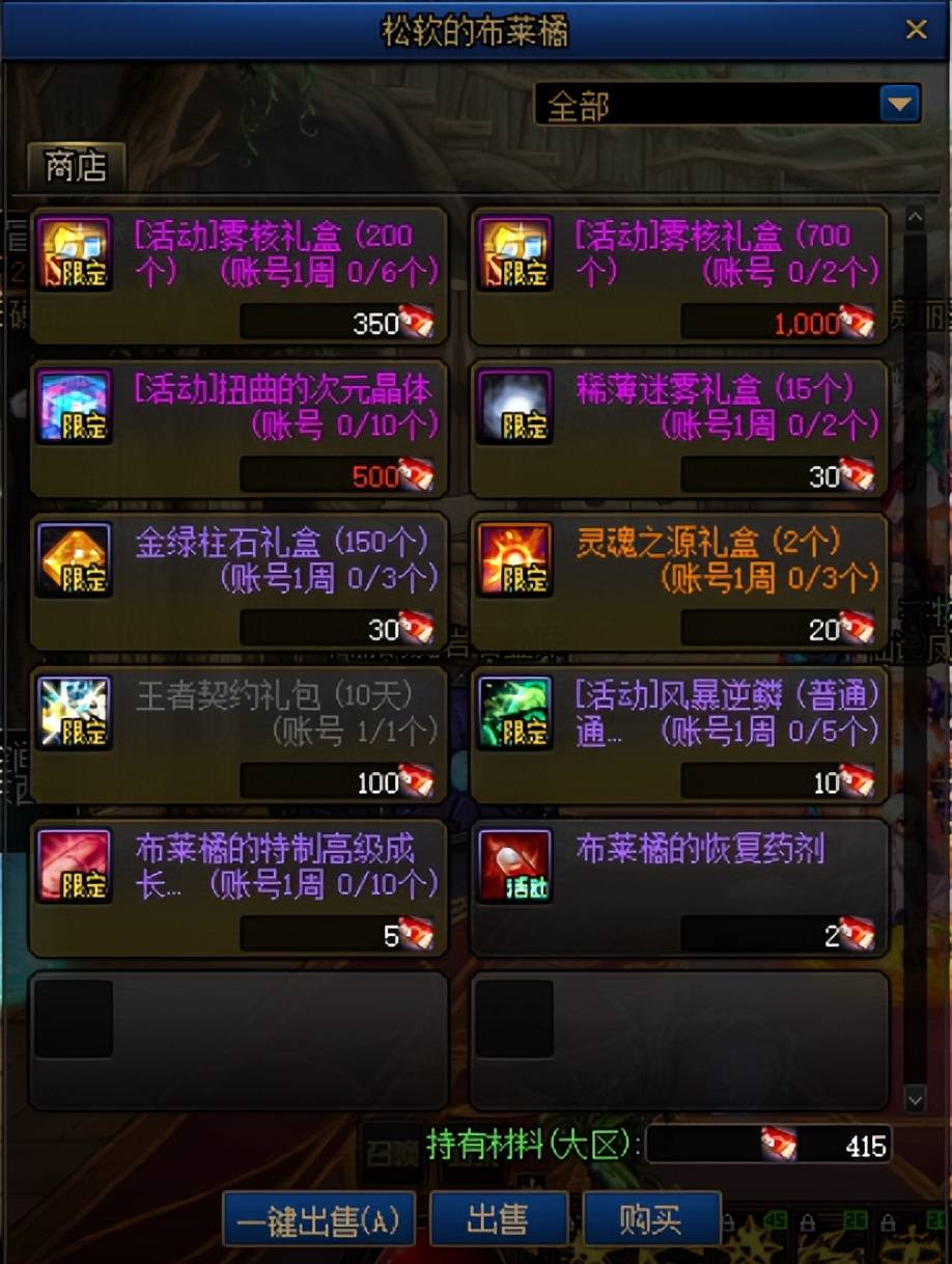 通过击败普通地下城和高级地下城的领主,可以获得活动材料喵条,使用喵条即可在赛丽亚房间的布莱橘商店当中兑换道具。其中较为重点的道具有雾核礼盒、扭曲的次元晶体和稀薄迷雾礼盒,也是笔者推荐优先兑换的道具,金绿柱石礼盒、灵魂之源礼盒、风暴逆鳞入场券等材料笔者认为价值不高,等道具实在富余的话再考虑兑换。