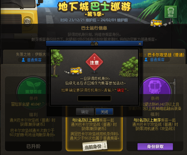 地下城巴士巡游活动已经是第三季了,本次达成司机身份的小伙伴也要在活动面板当中进行身份获取,点击按钮输入“确定“即可获得司机身份,否则通关副本之后依旧发放的是嫩芽硬币。