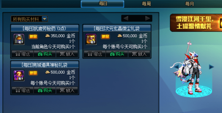 商城活动栏当中上线了每日道具栏,使用金币即可兑换疲劳药、次元玄晶微尘、商城道具神秘礼袋等好物,有需要的小伙伴可以前去选购。