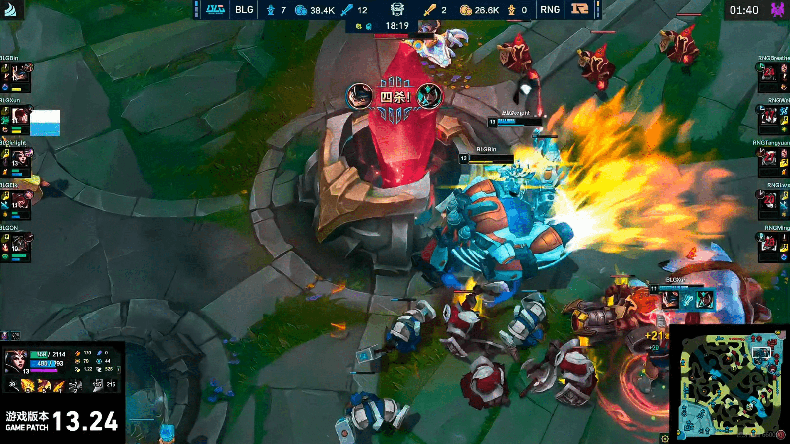 比赛中期BLG的进攻还在继续,RNG输出不足,打团必须要依赖兰博在场。在19分钟BLG九江RNG的上路高地防御塔拆掉,随后中路接连的混战,BLG打出2换3。